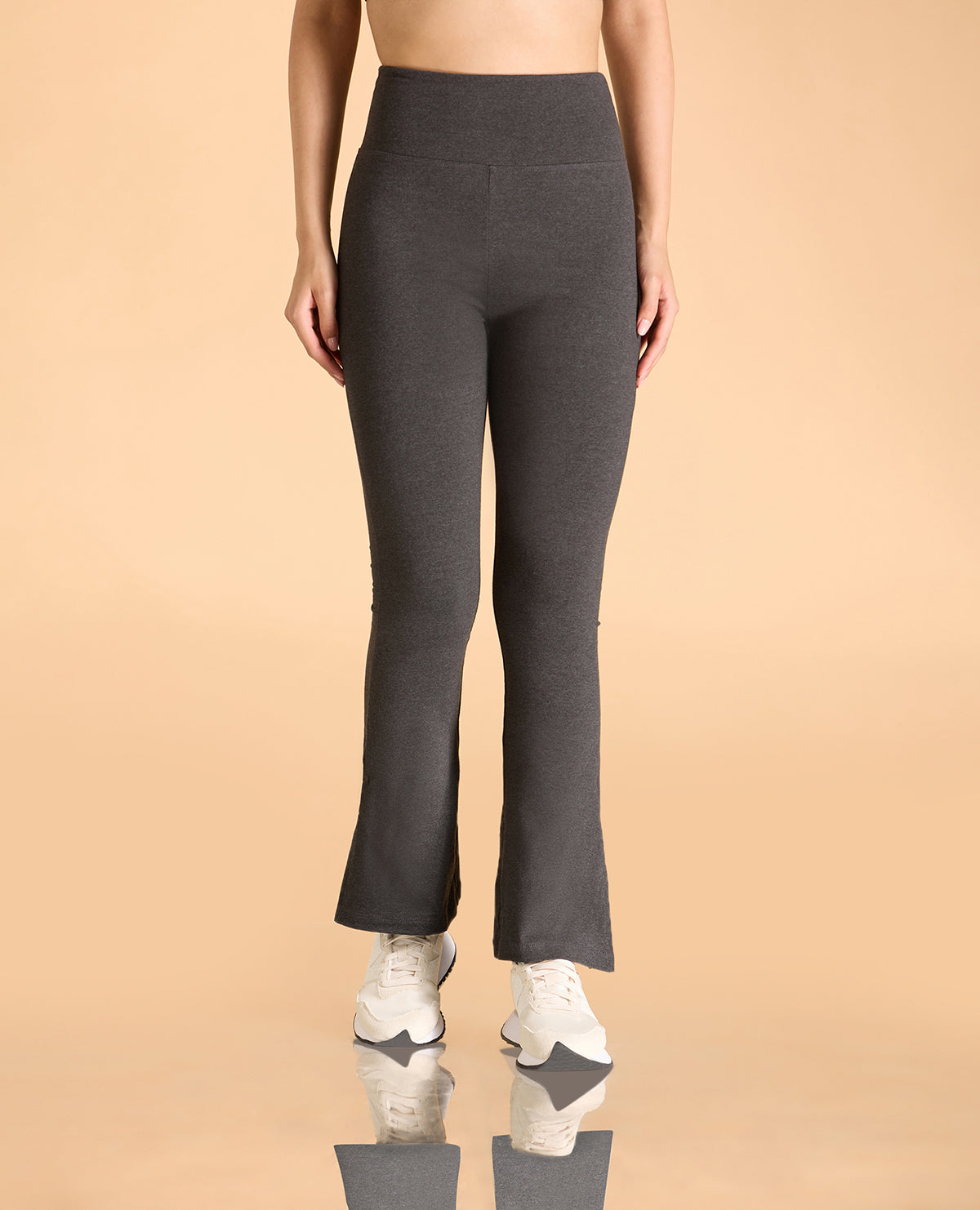 A: Our Flare Pants come in two fabric options: Second SKN fabric, known for its moisture-wicking and quick-drying properties, and a cotton+lycra blend for a soft and comfortable feel.