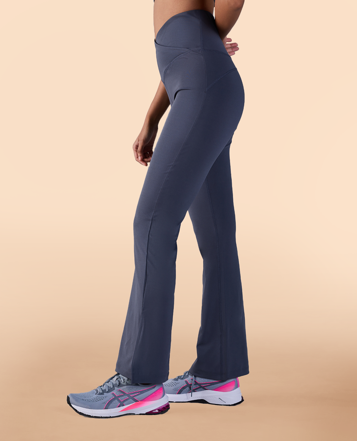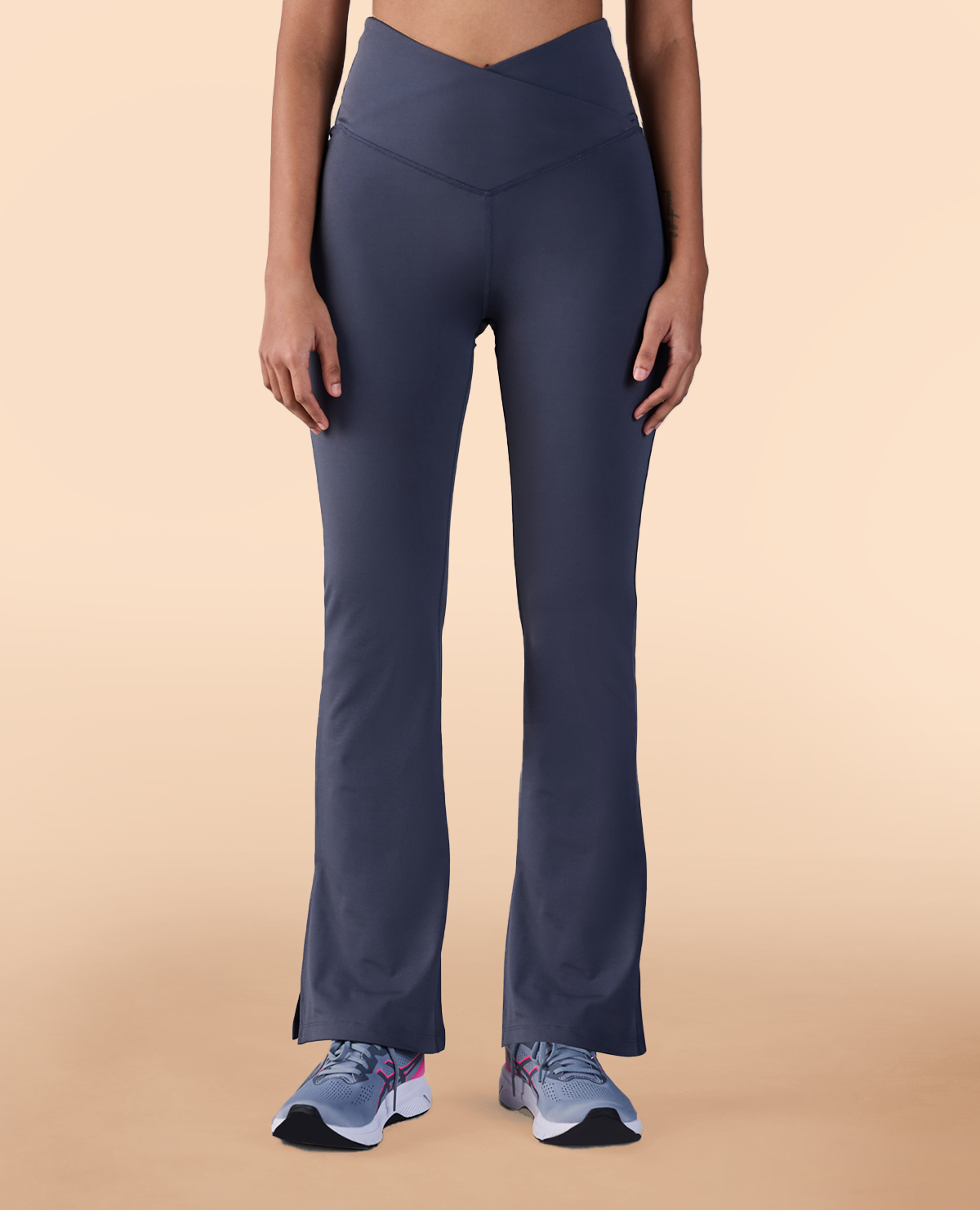 Are high-waist leggings not your style? Try these mid-waist cross-waistband flare pants made with our bestselling Second SKN Fabric. The criss-cross design gives a cinched waist look while looking fashionably unique. With a coin pocket to keep your essentials safe, these pants provide ultimate comfort and keep you dry no matter how sweaty you get. Key Features: - Criss-Cross waistband - Mid-Rise - Side Slit - Back pocket Model Details: Model wears an S, is 5’??????7’?????’????????/170 cms tall, Bust Size: 32.5’?????’????????, Waist: 25’?????’????????, Hip: 35" Fabric Details: Second SKN: 88% Polyester, 12% Spandex