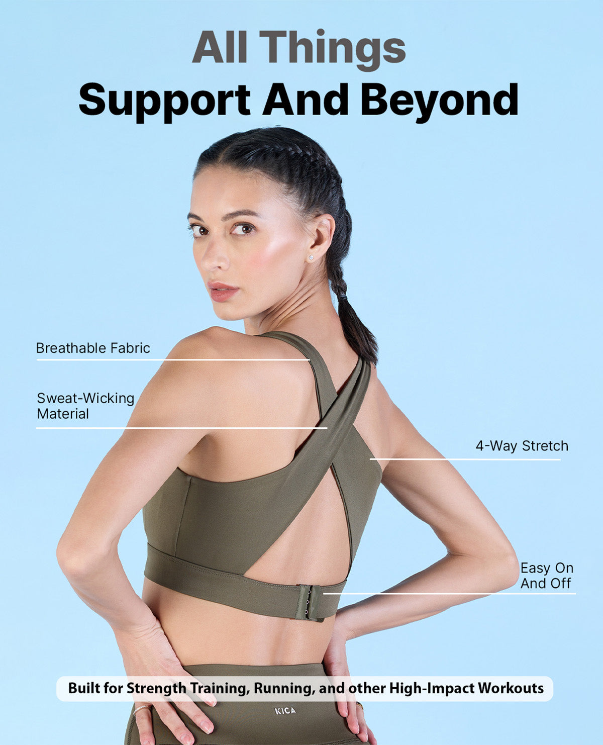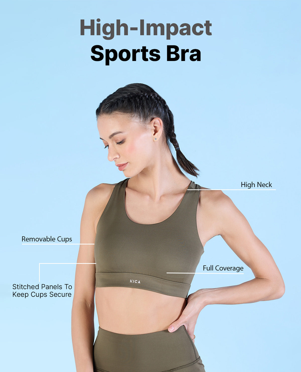 A: Kica offers sports bras in different impact levels to meet your specific activity needs. Our low-impact sports bras are suitable for activities like yoga or walking. For medium-impact activities such as cycling or hiking, we have sports bras that provide balanced support. And for high-impact activities like running or intense workouts, our high-impact sports bras offer maximum support and minimize bounce.