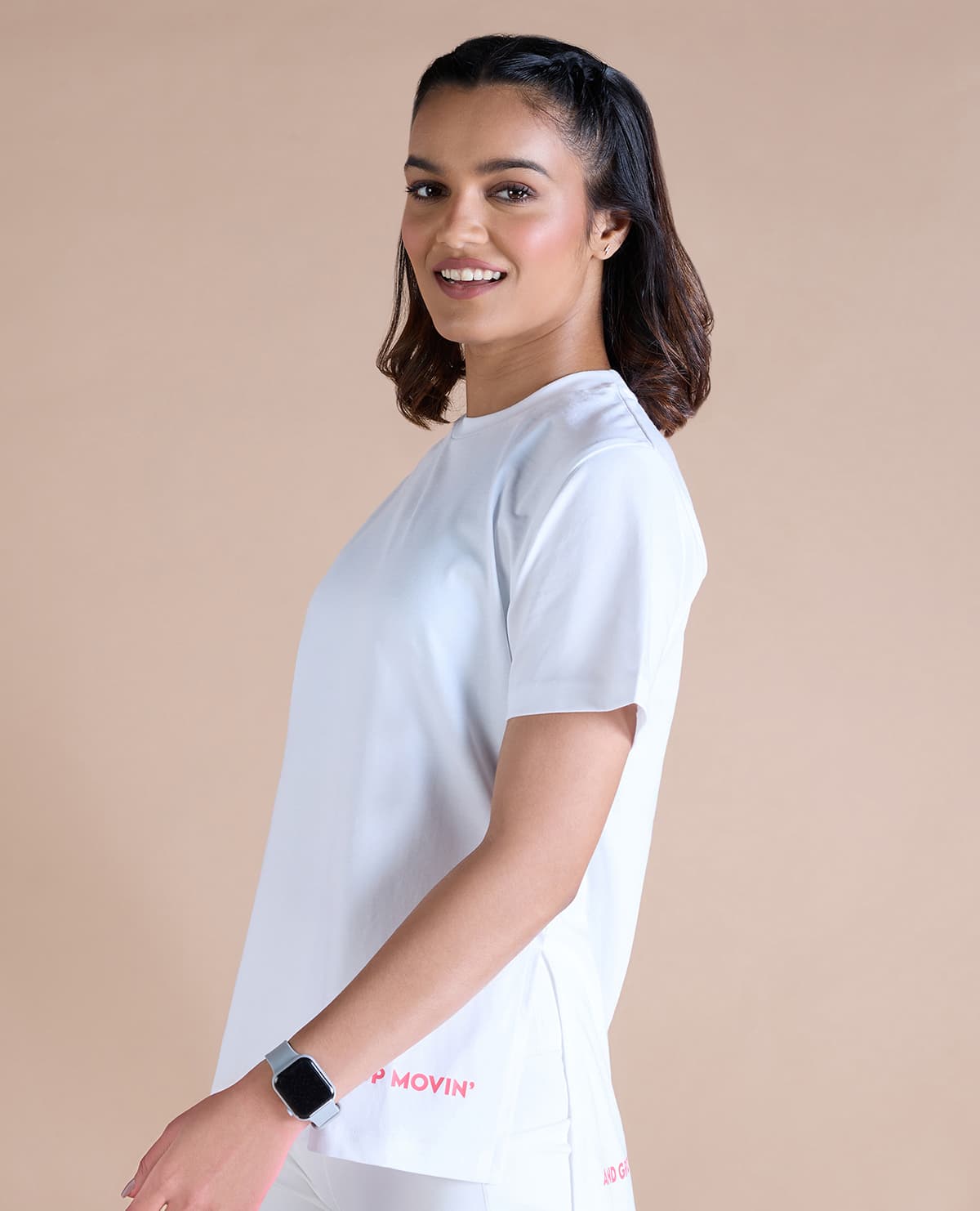 For our chicas on the go, our Ease In Everyday Top is a little reminder for you to not stop moving even when you find it difficult to do so. This round neck relaxed fit, cotton top is a must have for your everyday walks. Slits on the side and high low bottom hem to give a bit of a flare.