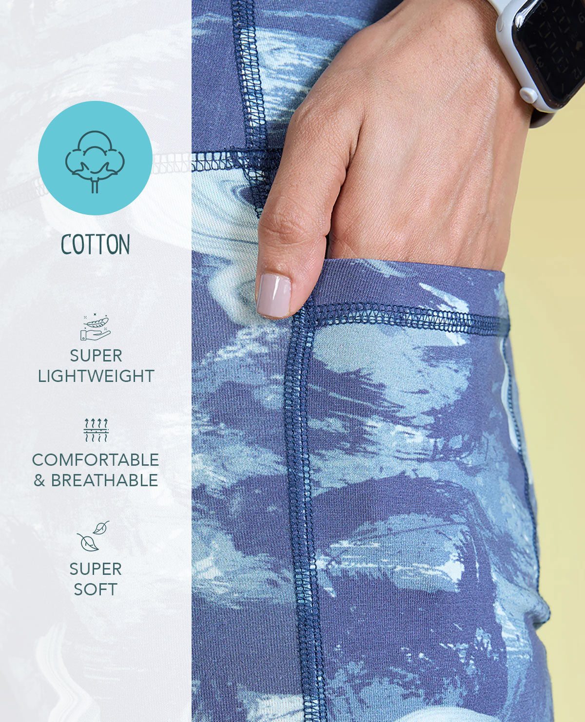 A: Our activewear leggings are available in two fabric options. For cotton leggings, the blend of premium-quality fabrics provides a soft and comfortable feel. If you prefer buttery-soft, moisture-wicking and quick-drying properties, our polyester SKN leggings are an excellent choice.