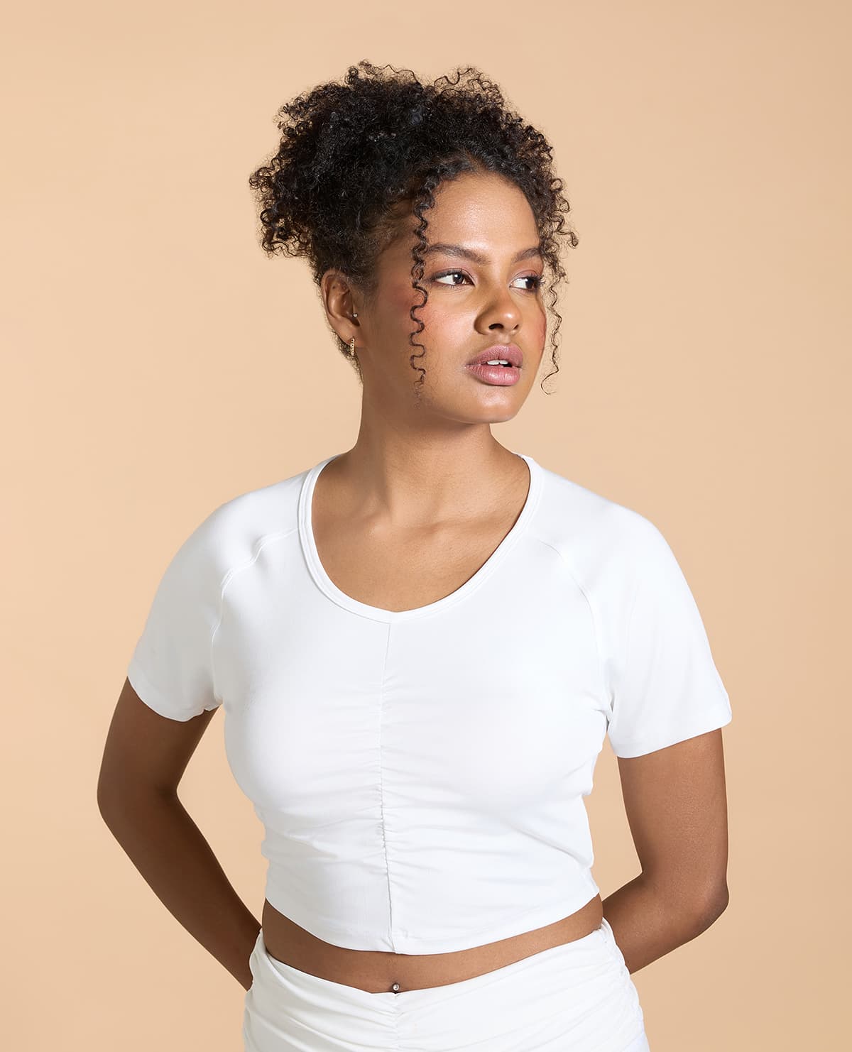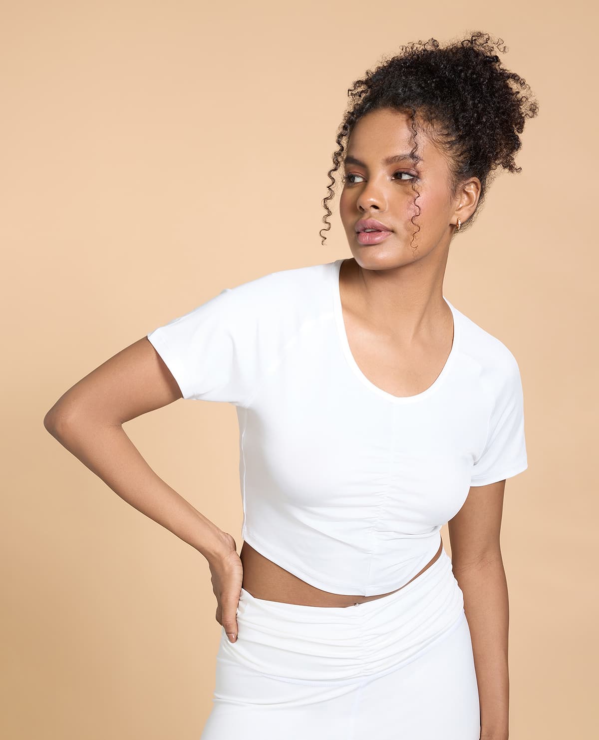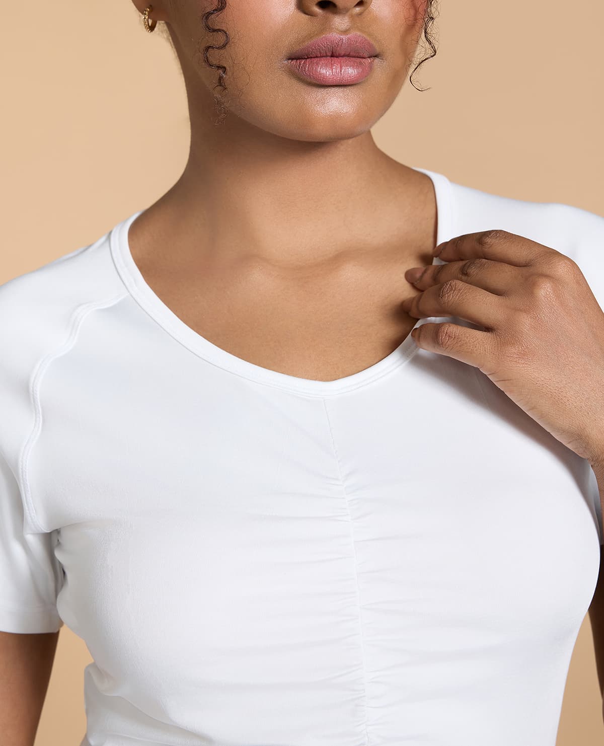 Designed in our smooth Feather Feel fabric, this fashionable Training Top feels like you're wearing absolutely nothing. It's super lightweight, breathable, and durable. - With elegant colours and ruched details at the hem, they're easy to style from your weekend brunch dates to energetic workouts.- Mesh back for extra breathability and a cooling effect.Suitable for strength training, dance and pilates flow, and everyday wear.Key Features:- Back Cut Detail- Back Mesh Panel- Round Neck