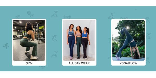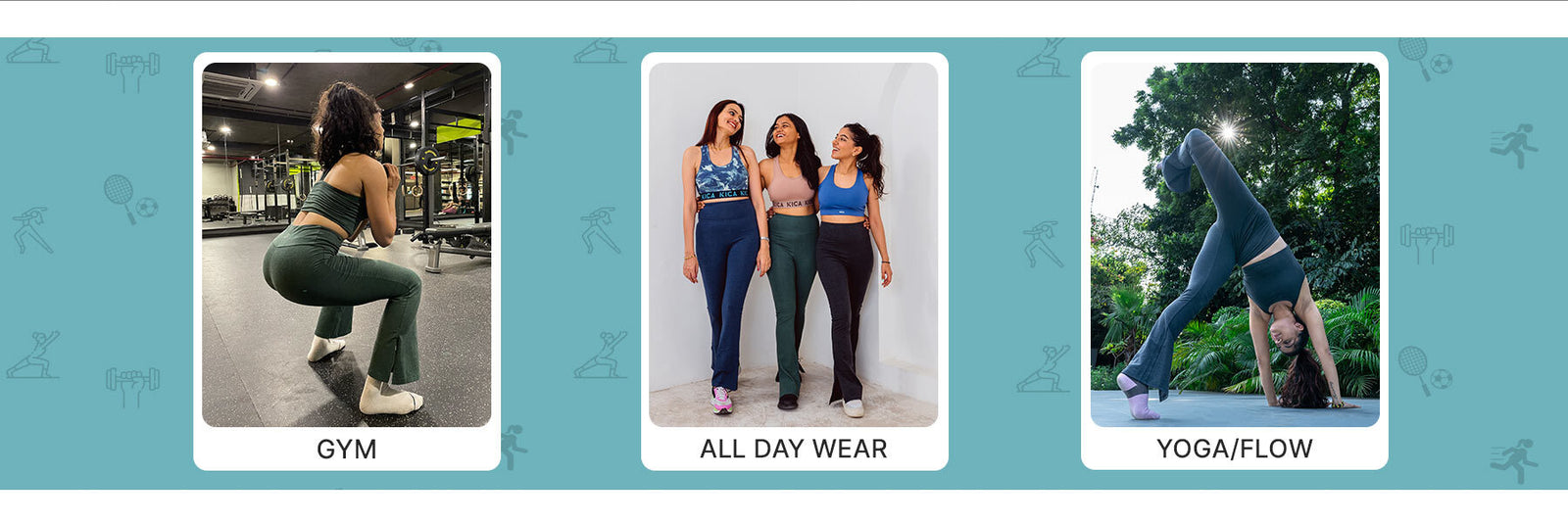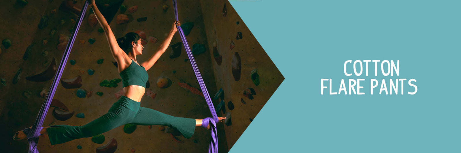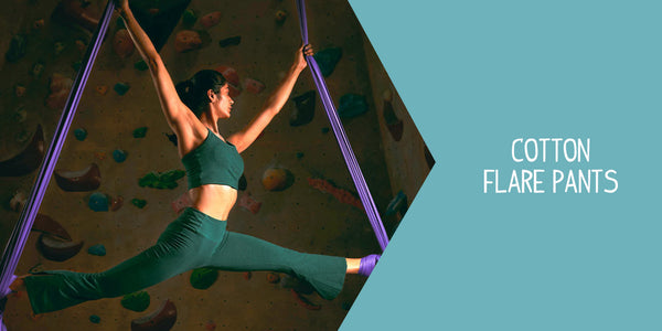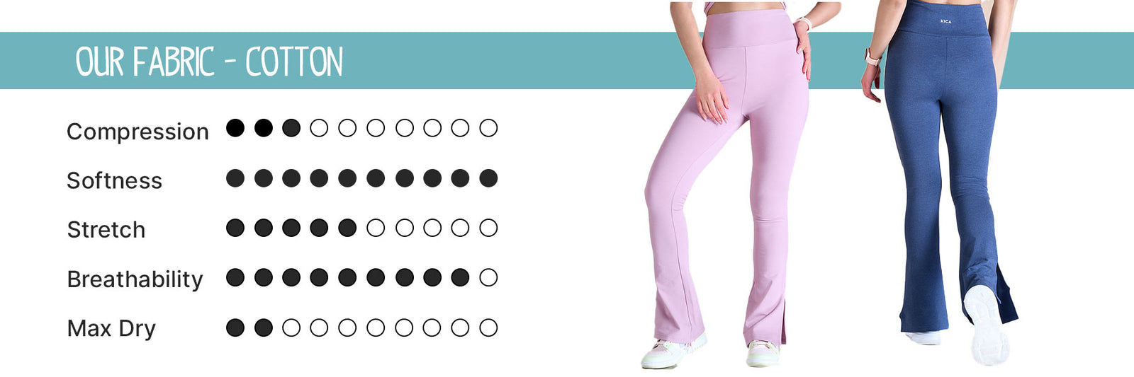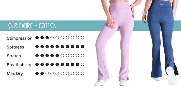 A: Our Flare Pants come in two fabric options: Second SKN fabric, known for its moisture-wicking and quick-drying properties, and a cotton+lycra blend for a soft and comfortable feel.