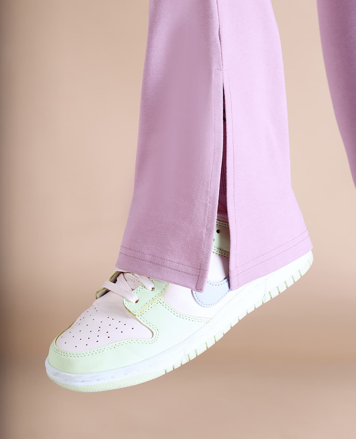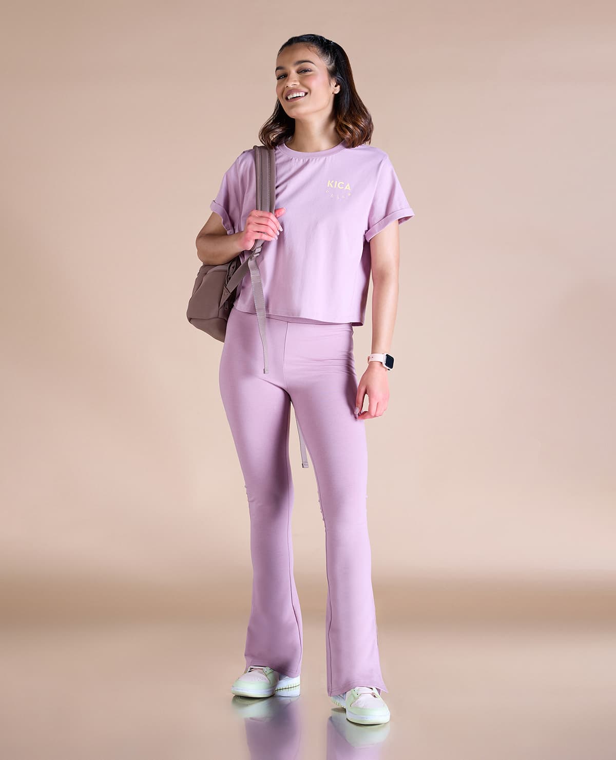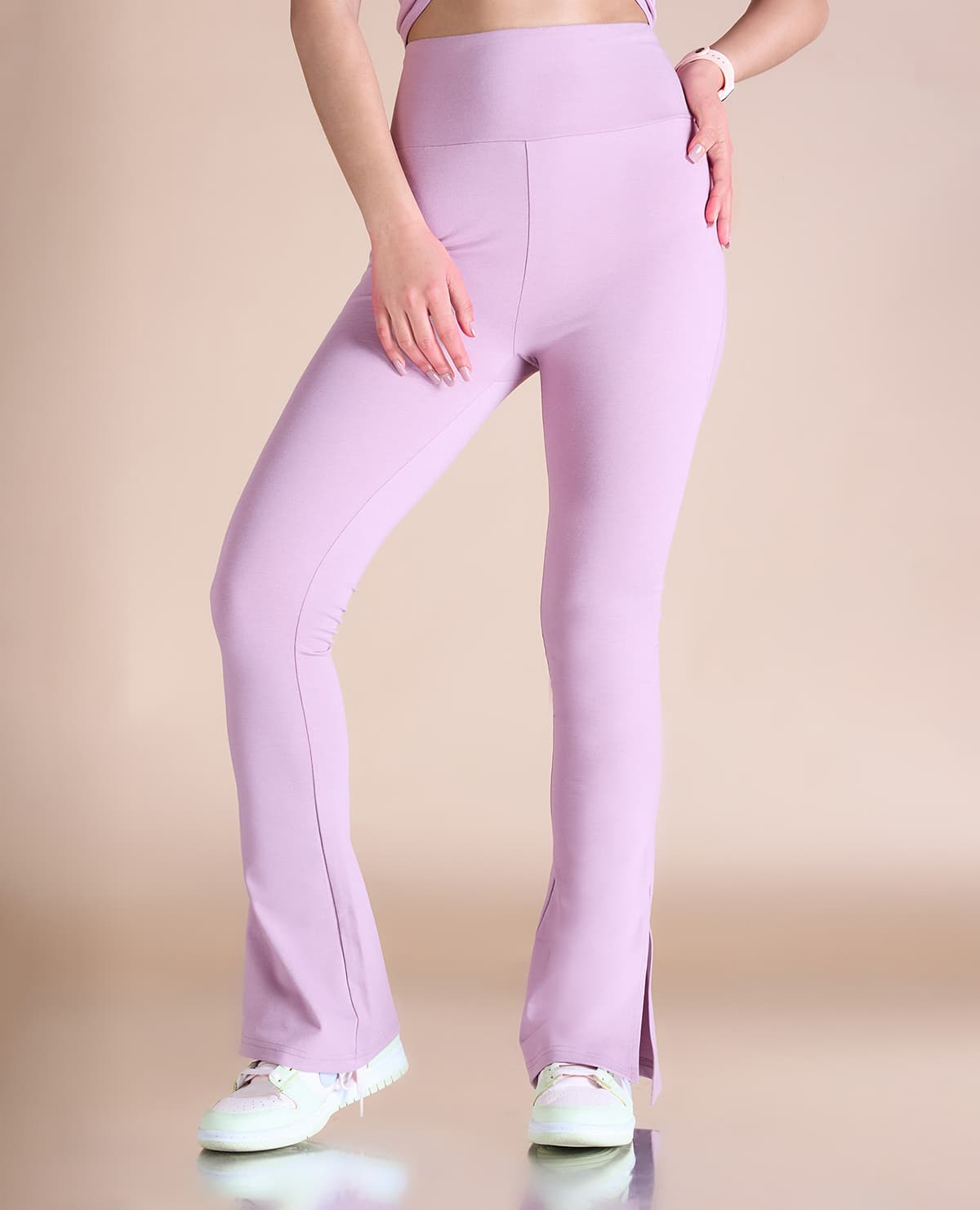 A: Our Flare Pants come in two fabric options: Second SKN fabric, known for its moisture-wicking and quick-drying properties, and a cotton+lycra blend for a soft and comfortable feel.