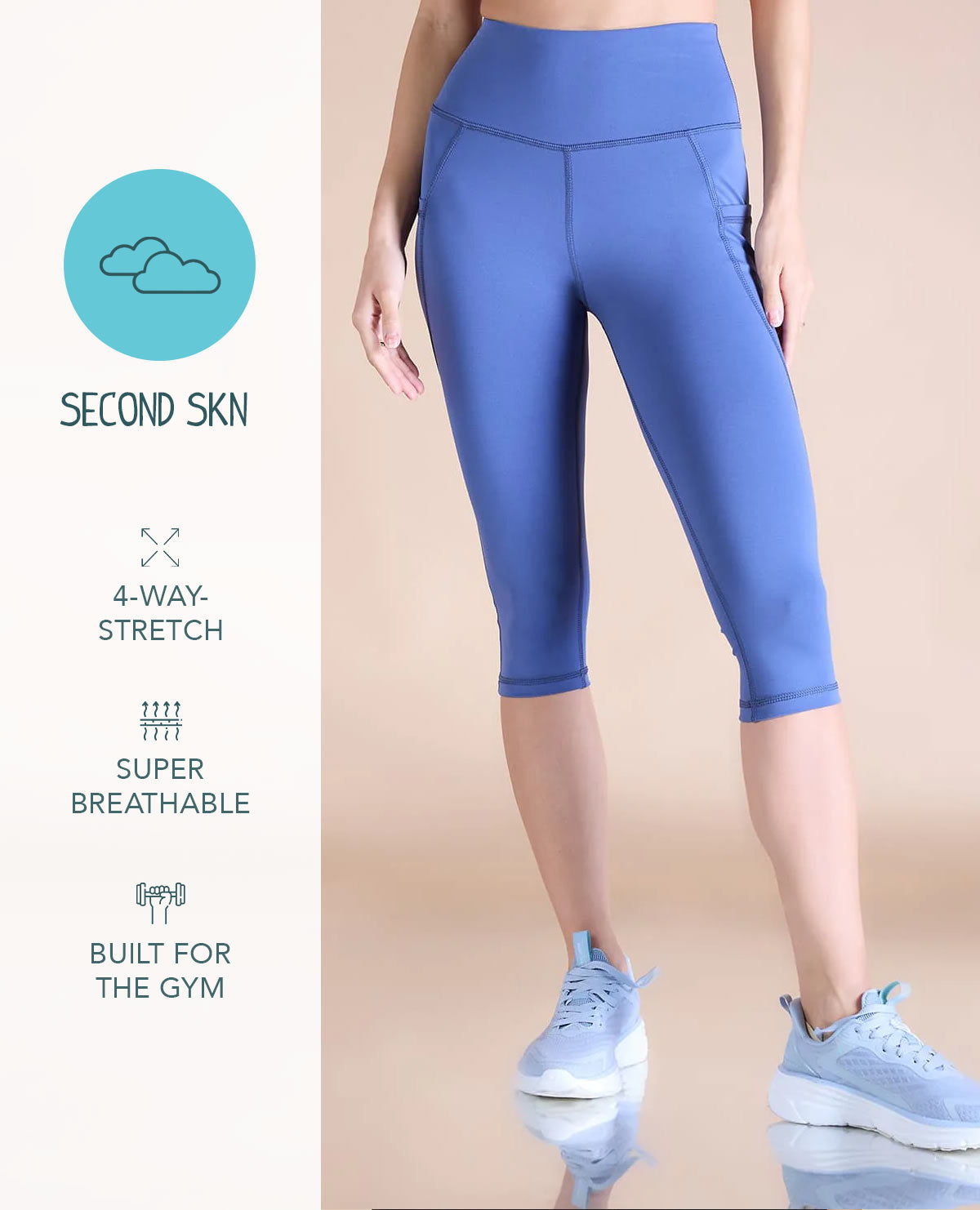 Second Skin Leggings now in 3/4th Calf Length Our leggings hug you in all the right places and the waistband literally never rolls down. We are so happy to introduce you the pair you will never take off.