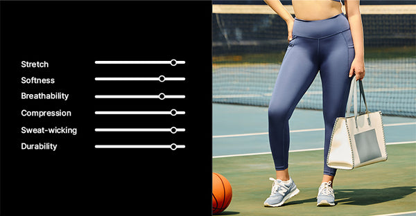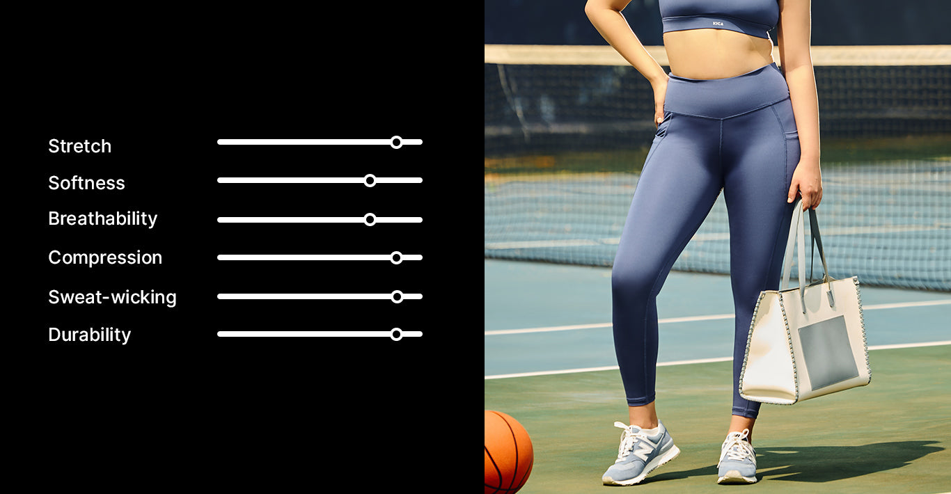 A: Our activewear leggings are available in two fabric options. For cotton leggings, the blend of premium-quality fabrics provides a soft and comfortable feel. If you prefer buttery-soft, moisture-wicking and quick-drying properties, our polyester SKN leggings are an excellent choice.